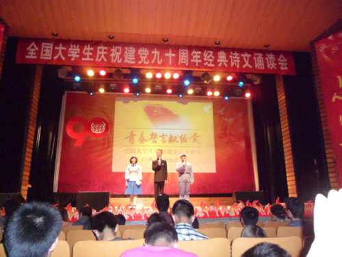 5月26日晚,“青春誓言献给党”全国大学生庆祝建党90周年经典诗文诵读会在同济大学一·二九礼堂隆重举行。来自同济大学、井冈山大学、复旦大学、上海交大、北京理工、大连理工等14所高校的500余名同学参加了诵读会。同...