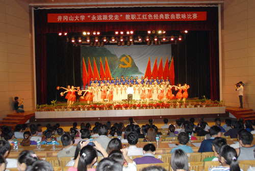 6月2日晚,我校隆重举行“永远跟党走”教职工红色歌曲歌咏比赛,这也是我校庆祝建党90周年系列活动的重头戏之一。机关各部门和各学院共800余名教职工分别组成21支代表队,登台合唱了40余首经典的红色歌曲。校领导金桂...