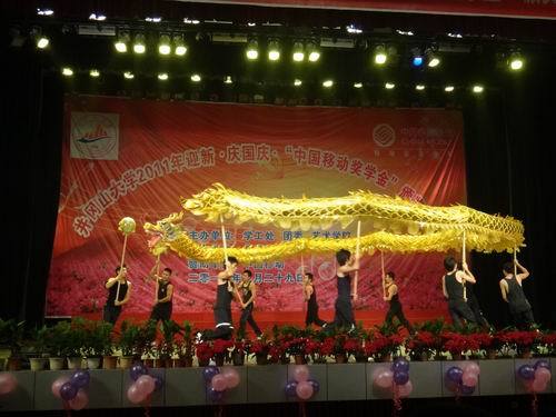 9月29日晚,由学工处、团委、艺术学院共同主办的2011年迎新、庆国庆、“中国移动奖学金”颁奖晚会在学生会堂隆重举行,副校长肖长春,有关部门负责人、老师和1300名新生到场观看了晚会。 体育学院的同学以矫健的身姿...