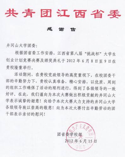 6月15日,团省委发来感谢信,感谢我校成功承办第八届“挑战杯”江西省大学生创业计划竞赛,感谢信全文如下: