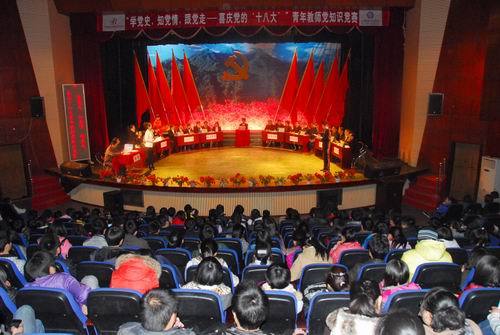 12月24日,由党委组织部、党委宣传部、校团委联合举办的“学党史、知党情、跟党走——喜庆党的十八大青年教师党知识”竞赛举行。党委副书记、纪委书记金桂英,副校长肖长春以及300余名师生一起观看了比赛。 由化学化...