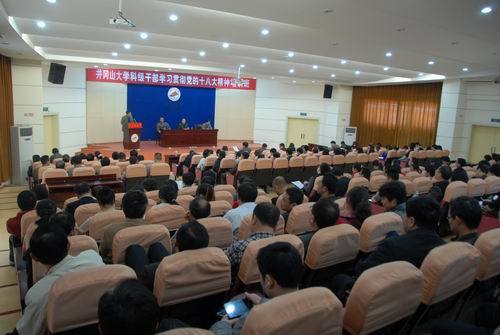 4月23日下午,校长张泰城应邀为我校科级干部学习贯彻党的十八大精神培训班作专场辅导讲座。党委副书记、纪委书记金桂英主持,全校科级干部以及部分高职称高学历教师等共300余人聆听了讲座。 张泰城以《坚持内涵式发展...