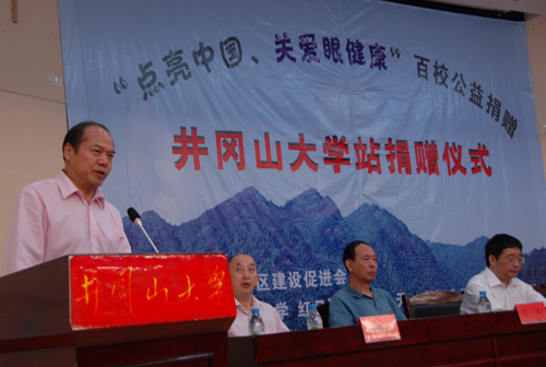5月24日,“点亮中国、关爱眼健康”百校公益井冈山大学站捐赠仪式在我校举行。中国老区建设促进会老干部工作部副部长李泓霖,校长张泰城分别致辞,副校长肖长春主持。江西省老区建设促进会副会长兼秘书长杨勇出席,红...