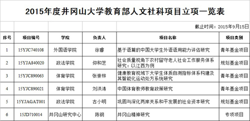截止到目前为止,我校2015年度教育部人文社会科学研究项目获批一般项目5项,专项任务项目1项,共计6项,取得历史最好成绩。其中,政法学院获批2项、体育学院获批2项、外国语学院获批1项、井冈山研究中心获批1项,项目...