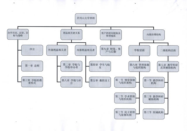 《井冈山大学章程》(以下简称《章程》)分为序言和正文两大部分。序言的主要内容是:简述了学校历史沿革、说明了《章程》制定的主要依据。正文部分由10章构成,总计108条,全文14800余字。 第一章总则。本章明确了学...