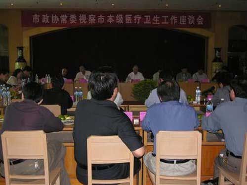 市政协常委视察市本级医疗卫生工作座谈会在附属医院召开 座谈会会场 刘育椿、王先侯、刘冬仙、沈锦荣、康泰、王伴青、符红涛、吴林诠等在主席台就坐 5月19日下午,市政协常委视察市本级医疗卫生工作座谈会在附属医...