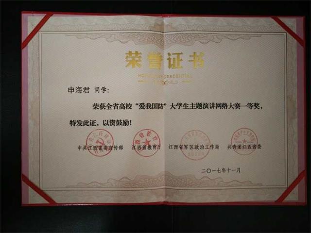 近日,在江西省“爱我国防”大学生主题演讲大赛中,我校民兵应急分队队员,商学院市场营销专业15本(1)班申海君同学获得一等奖。并将代表江西省参加全国决赛。指导老师肖晓获学生指导奖,井冈山大学获单位组织奖。 ...