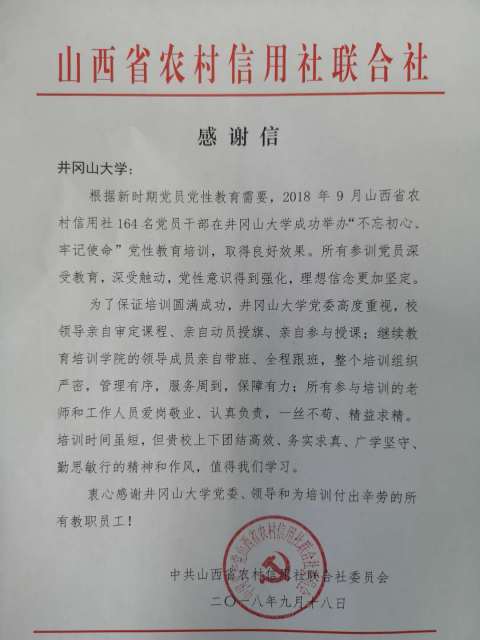 对我校承办培训班表示感谢,对我校红色培训工作的理念和做法表示肯定 9月18日,学校收到山西省农村信用社联合社发来的感谢信,衷心感谢井冈山大学党委、领导和为培训付出辛劳的所有教职工。 感谢信中说,根据新时期党...