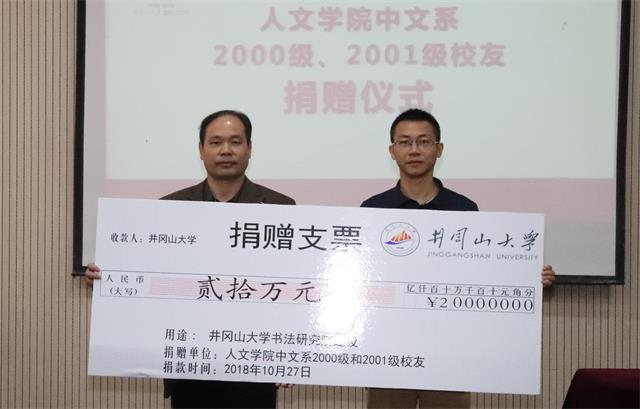 10月27日上午,人文学院中文系2000级和2001级校友捐赠仪式在人文学院举行。校党委书记彭涉晗,校党委常委、纪委书记史胜平出席捐赠仪式。彭海涛、戴聚斌等代表人文学院中文系00级和01级的142名校友向井冈山大学书法研...