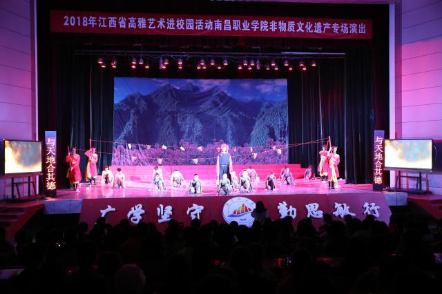11月16日下午,2018江西省高雅艺术进校园专场演出暨南昌职业学院江西国家级“非遗”文化歌舞专场在我校学生会堂精彩演出。党委常委、宣传部长李裕福及全校1400余名师生观看了演出。 演出以声势浩大的永新盾牌舞开场。...