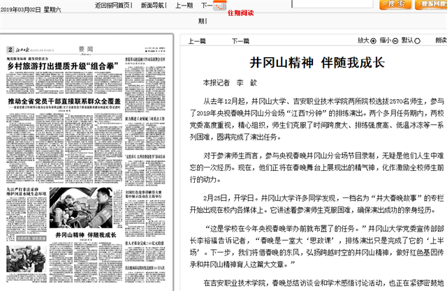 (本报记者 李 歆)从去年12月起,井冈山大学、吉安职业技术学院两所院校选拔2570名师生,参与了2019年央视春晚井冈山分会场“江西7分钟”的排练演出。两个多月任务期内,两校党委高度重视,精心组织,师生们克服了时...
