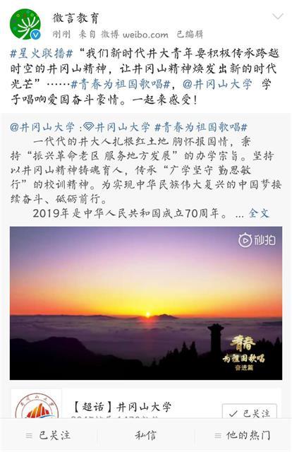 7月8日,教育部官方微博“微言教育”转载并推介了我校官方微博发出的“青春为祖国歌唱”井大篇MV,引起了全校师生及社会公众的广泛关注。该作品唱出了井大师生的爱国情、奋进心,是“一堂行走的思政课”,也是“唱响...