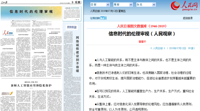 7月12日,《人民日报》09版刊登我校校长曾建平教授署名文章《信息时代的伦理审视》,这是曾建平教授第二次在人民日报发表学术文章。全文如下: 信息时代的伦理审视 曾建平 ■人与人工智能的关系,既不是主体与客体之...