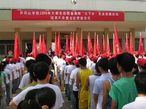 大学生志愿者暑期社会实践出征仪式隆重举行 7月7日上午,学校隆重举行了大学生暑期“三下乡”社会实践活动动员大会暨出征授旗仪式,党委副书记孙甦代表校党委行政讲话,副校长桂国庆主持,在校的领导康泰、罗学渭、王...