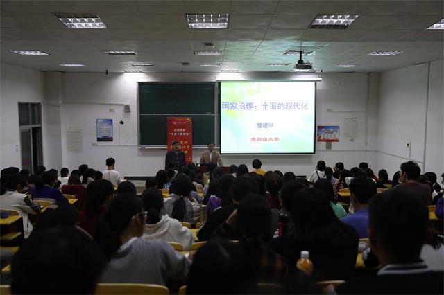 11月12日晚,党委副书记、校长曾建平为大学生宣讲党的十九届四中全会精神,马克思主义学院19级思政专业、19级党史专业,医学部19级临床专业,体育学院19级社体专业共120余人聆听了宣讲。这是我校开展江西高校“十百千...