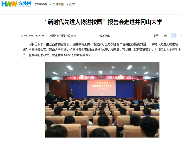1月4日下午,由江西省委宣传部、省委教育工委、省教育厅主办的江西“奋斗的我最美的国——新时代先进人物进校园”巡回报告会在井冈山大学举行。巡回报告会宣讲团成员彭民安、周志虹、韦华璋、赵延宽作宣讲,为井冈山...