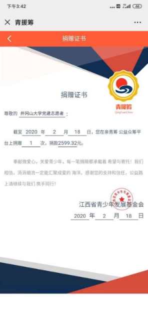 日前,江西省青少年基金会为我校第二批经开区党建志愿者20名学生党员颁发了捐赠证书,感谢他们为疫区捐款的高尚行为。江西省青少年基金会将于近期把我校第二批经开区党建志愿者的善款2599.32元汇往疫区。 临时党支部...