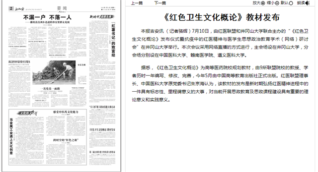 《红色卫生文化概论》教材同时发布 7月10日,由红医联盟和井冈山大学主办的“《红色卫生文化概论》发布仪式暨抗疫中的红医精神与医学生思想政治教育学术(网络)研讨会”在井冈山大学举行,本次云会议采用网络直播的...