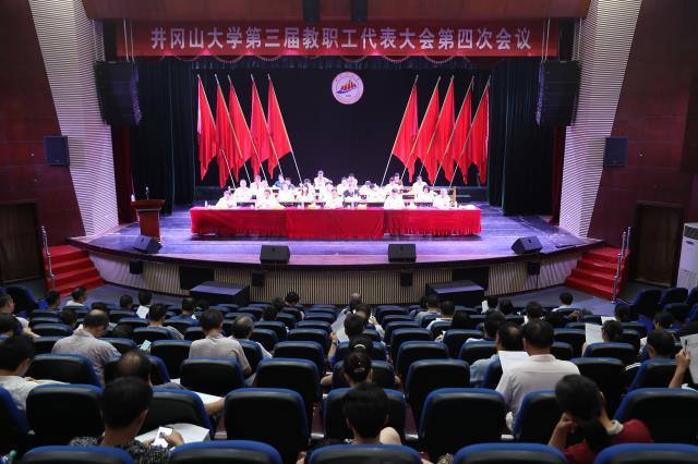 大会会场 在家的校领导与主席团成员在主席台就座 7月15日,学校召开第三届教职工代表大会第四次会议。143名正式代表出席会议,部分列席代表列席会议。党委书记胡春晓讲话,党委副书记、校长曾建平作学校工作报告,党...