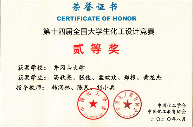 近日,中国化工学会、中国化工教育协会主办的第十四届全国大学生化工设计竞赛全国总决赛公布了获奖名单,我校化学化工学院韩润林、陈民、刘小兵三位老师指导,由汤秋亮、张俊、孟欢欢、郑根、黄龙杰等五位同学所组成...