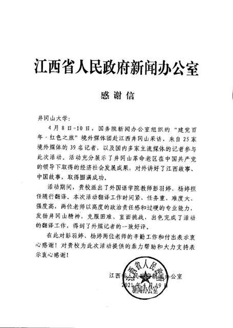 日前,省委宣传部、省政府新闻办公室向我校发来感谢信,感谢我校为做好中宣部、国务院新闻办公室组织的“建党百年·红色之旅”系列采访活动的随行翻译而付出的辛勤和努力,尤其是感谢外国语学院彭羽婷、杨婷两位青年教...