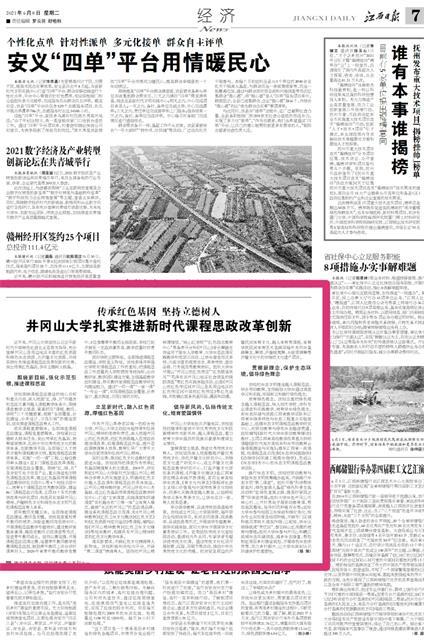 传承红色基因 坚持立德树人 井冈山大学扎实推进新时代课程思政改革创新 近年来,井冈山大学坚持以习近平新时代中国特色社会主义思想为指导,充分发挥井冈山及周边地区丰富的红色资源和绿色生态资源、古庐陵文化资源,...