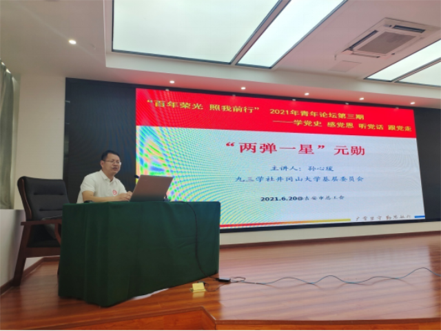 6月20日,九三学社井冈山大学基层委员会承办了吉安市委会2021年第三期青年论坛,会议在吉安市总工会举行。九三学社吉安市委会主委周密出席会议,九三学社井冈山大学基层委员会6名社员参加活动。 本次青年论坛以“两弹...