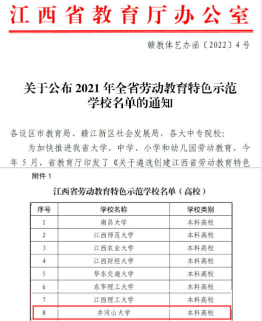 近日,江西省教育厅公布2021年全省劳动教育特色示范学校名单,井冈山大学首批入选,全省共20所本科高校入选。 学校认真贯彻落实党中央、国务院关于全面加强新时代大中小学劳动教育的部署,立足地方特色资源,把井冈...