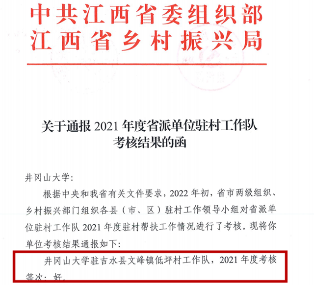 近日,中共江西省委组织部、江西省乡村振兴局下发《关于通报2021年度省派单位驻村工作队考核结果的函》,我校驻吉水县文峰镇低坪村工作队在年度考核中荣获“好”等次。 我校坚持以习近平新时代中国特色社会主义思想...