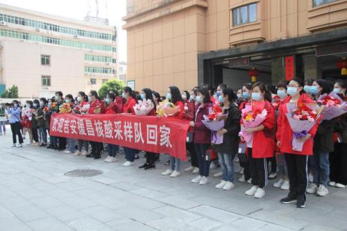 4月11日,吉安市援昌核酸应急采样队在圆满完成抗疫任务返回吉安,经过10天的集中隔离,现已顺利出关,之后将进行4天的居家健康监测。上午10时,市疫情防控指挥部有关领导专程到隔离点迎接,举行了简短而热烈的迎接仪...