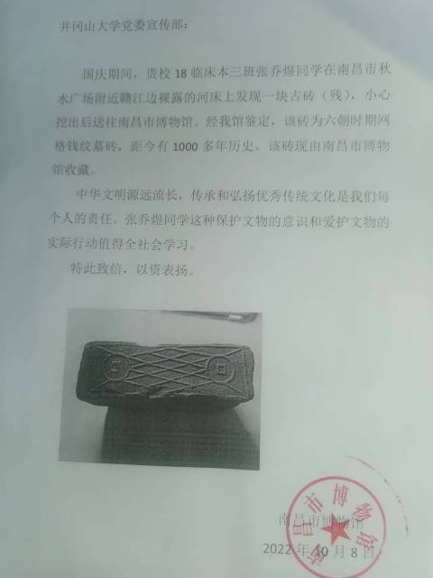 10月8日,南昌市博物馆给我校发来感谢信,感谢我校医学部大学生拾到1000多年前的文物主动上交。信中写到:“国庆期间,贵校18临床本三班张乔煜同学在南昌市秋水广场附近赣江边裸露的河床上发现一块古砖(残),小心挖...