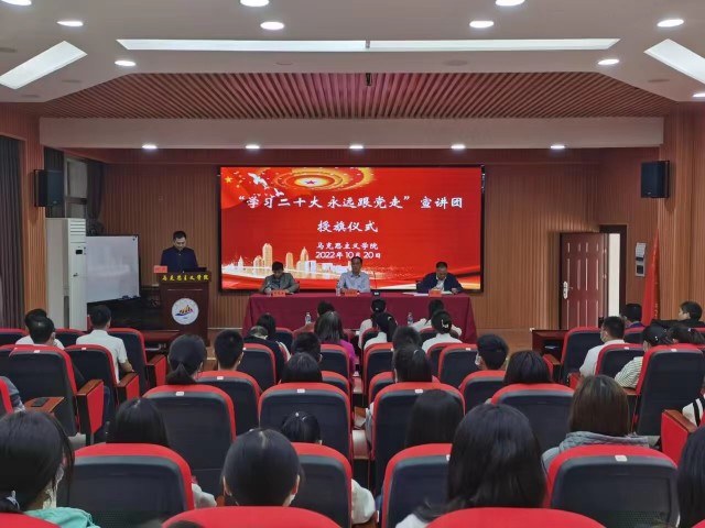 为扎实推进党的二十大精神和党中央精神的学习宣传,10月20日下午,马克思主义学院举行“学习二十大 永远跟党走”宣讲团授旗仪式,校党委副书记刘祖文应邀出席并授旗。学院全体班子成员、宣讲团成员、井研会和青研社成...
