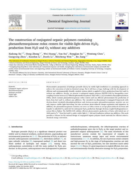 近日,我校化学化工学院钟鸿博士团队在化工领域顶级期刊《Chemical Engineering Journal》(IF=16.744)发表题为“The construction of conjugated organic polymers containing phenanthrenequinone redox centers ...