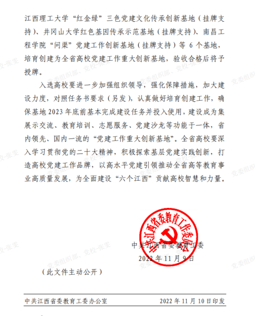 经过各校申报、省外专家评审、现场答辩和工委会研究,近日,江西省教育工委下发了《关于公布省属本科高校党建工作重大创新基地评审结果的通知》,我校申报的“井冈山大学红色基因传承示范基地”项目脱颖而出,获批挂...