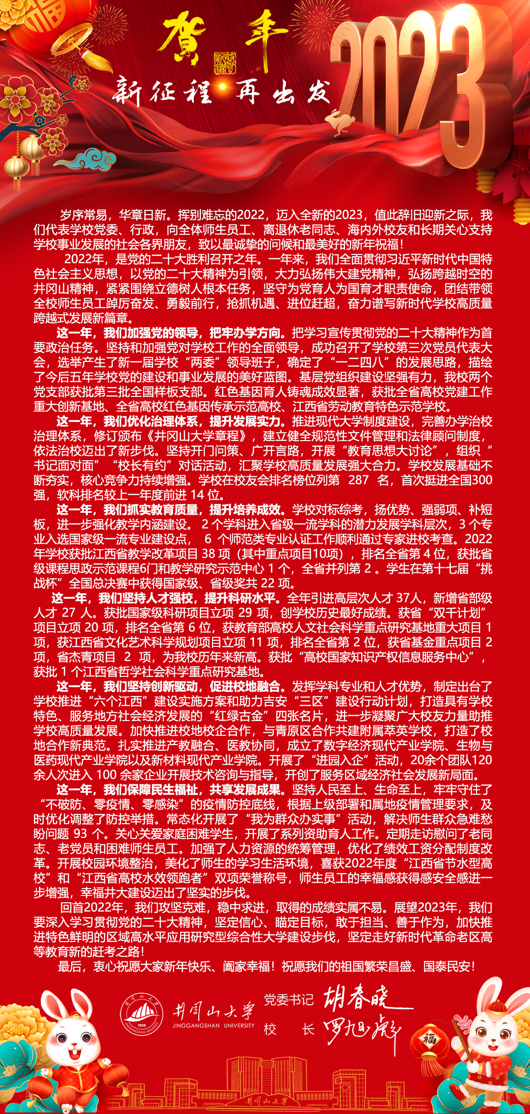 刚刚过去的2022年,是党和国家历史上极为重要的一年,党的二十大胜利召开。这一年,学校成功召开了第三次党员代表大会,全面擘画了今后五年发展的宏伟蓝图;这一年,学校全面贯彻习近平新时代中国特色社会主义思想,...