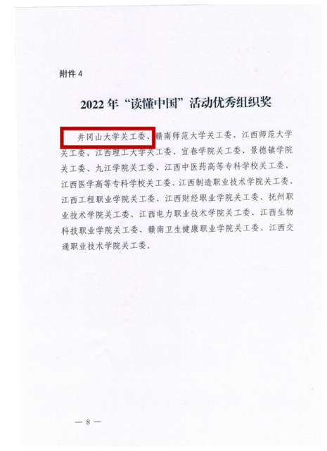 近日,从教育部关工委传来喜讯,在2022年“读懂中国”活动中,我校选送的微视频作品《用好红色资源,传承红色基因》获优秀微视频奖,受到教育部表扬。 此外,江西省教育关工委2022“读懂中国”评选揭晓:我校选送的作...