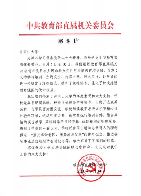 3月14日,学校收到中国共产党教育部直属机关委员会发来的一封感谢信,对于井冈山大学承办的这次培训班的精心安排和一直以来的工作支持表示感谢,信中写道:此次培训得到了井冈山大学的高度重视和大力支持。学校党委书...